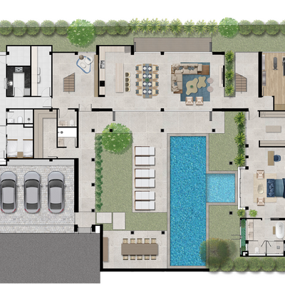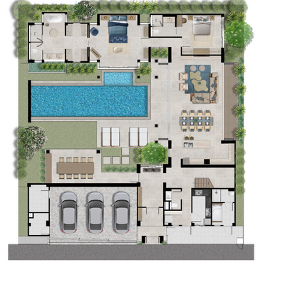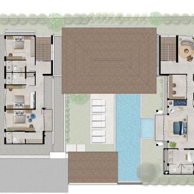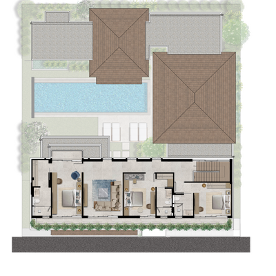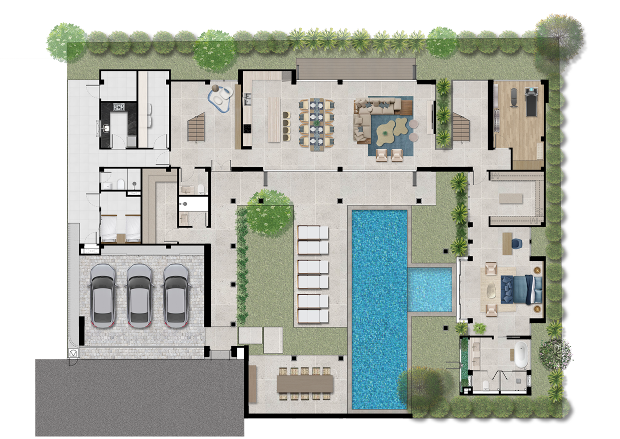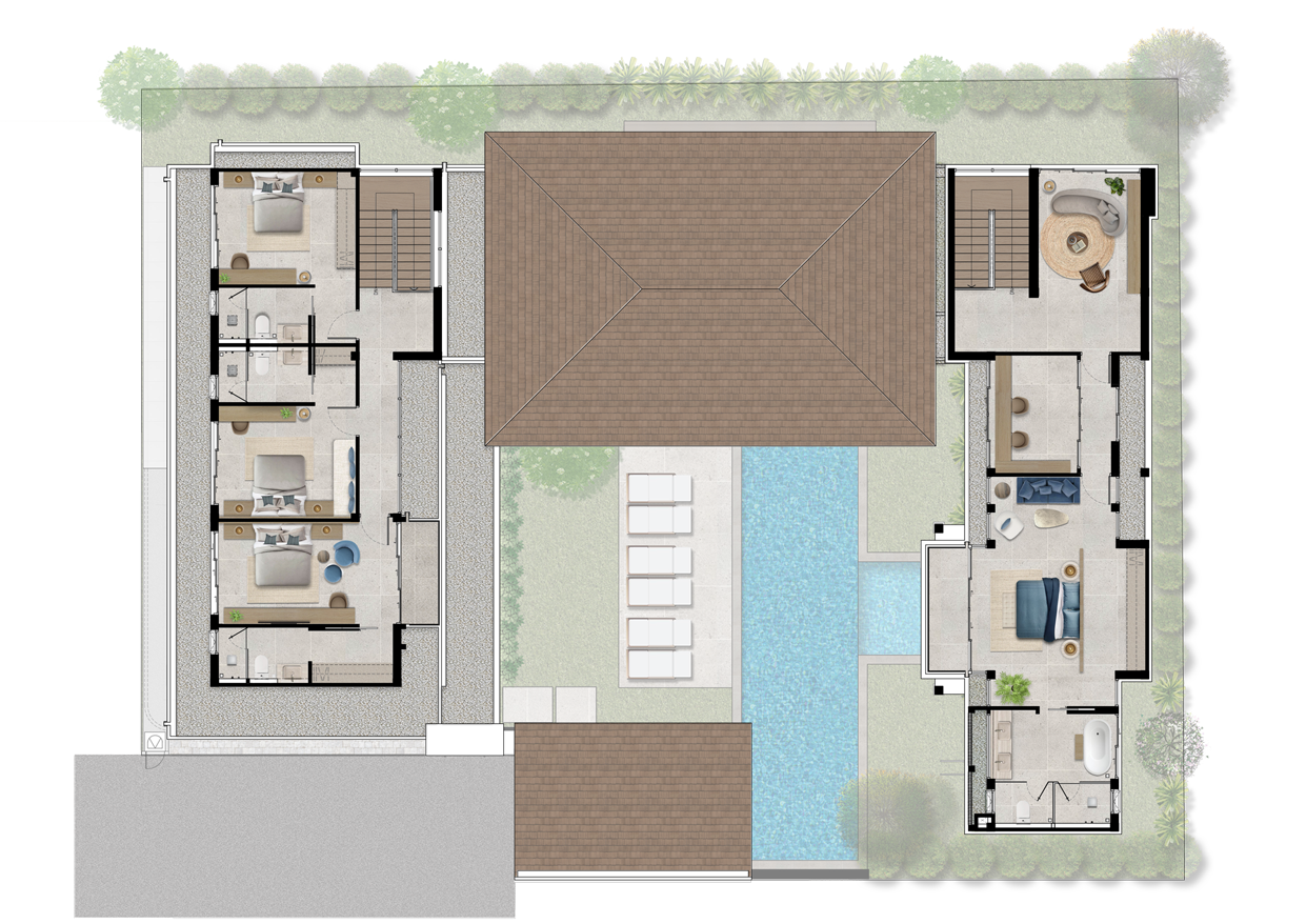 The Type C villa raises the bar yet again with even more room to live your best life and entertain guests. While it shares many of the same design features as the Type B, the Type C now has parking for three with an attached storage room, a bigger pool with its own plunge pool, as well as an additional Thai-style kitchen and maid's quarters. The poolside dining and barbecue area is increased to accommo- date more guests, while the master bedroom is even more lavish with a cavernous walk-in closet and spa-like bathroom.