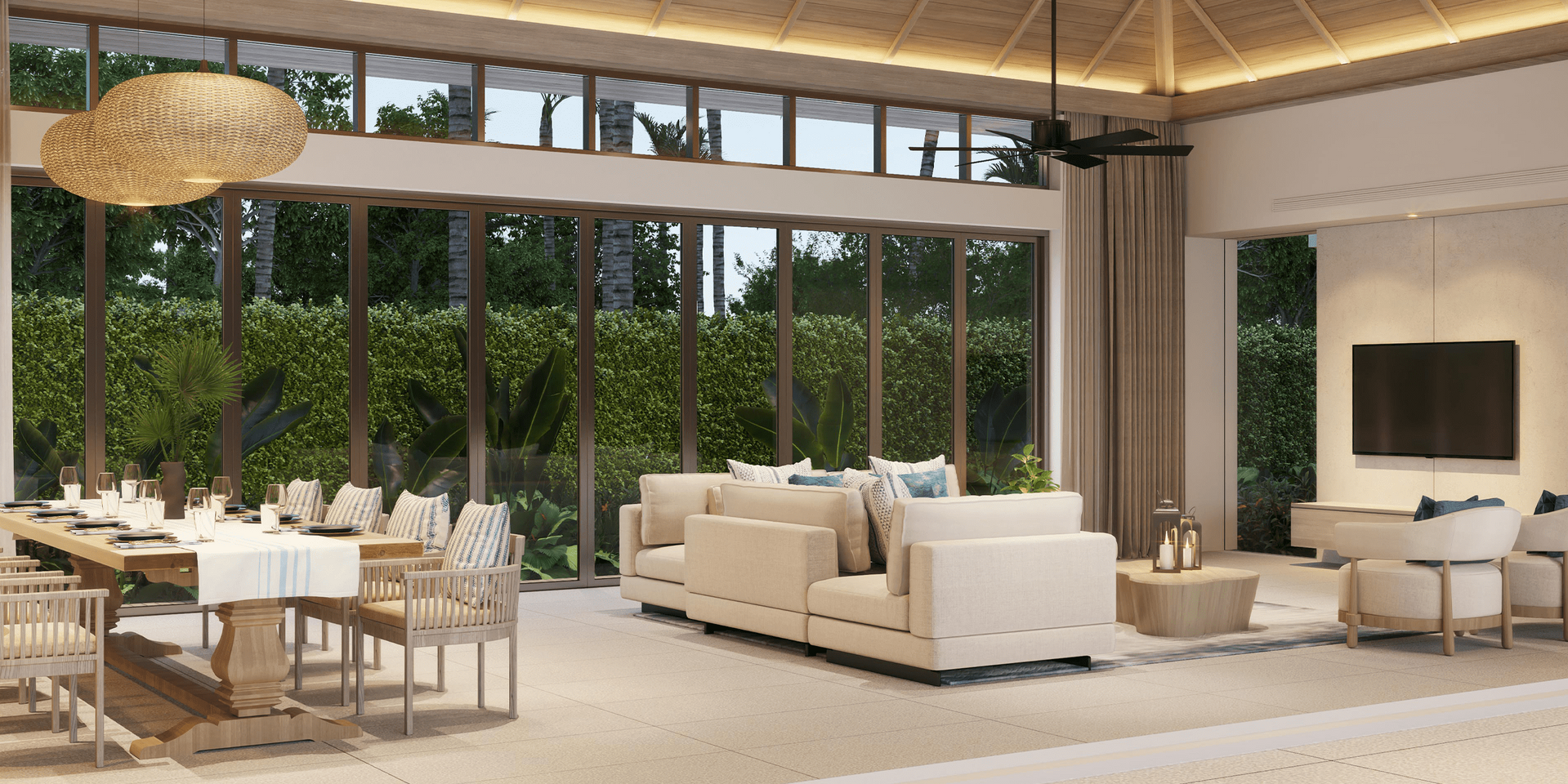 Despite being the most modest of our four villa types, the 192 sq.m. Type A leaves little else to be desired. The covered parking for two vehicles leads through the foyer and directly into the heart of any home – the kitchen. Beyond the kitchen island, the open floor plan spills into the dining area which easily sits six and the living room beyond, flanked on both sides by towering windows.