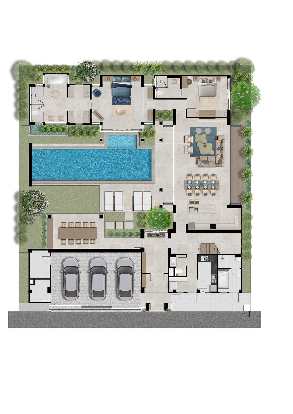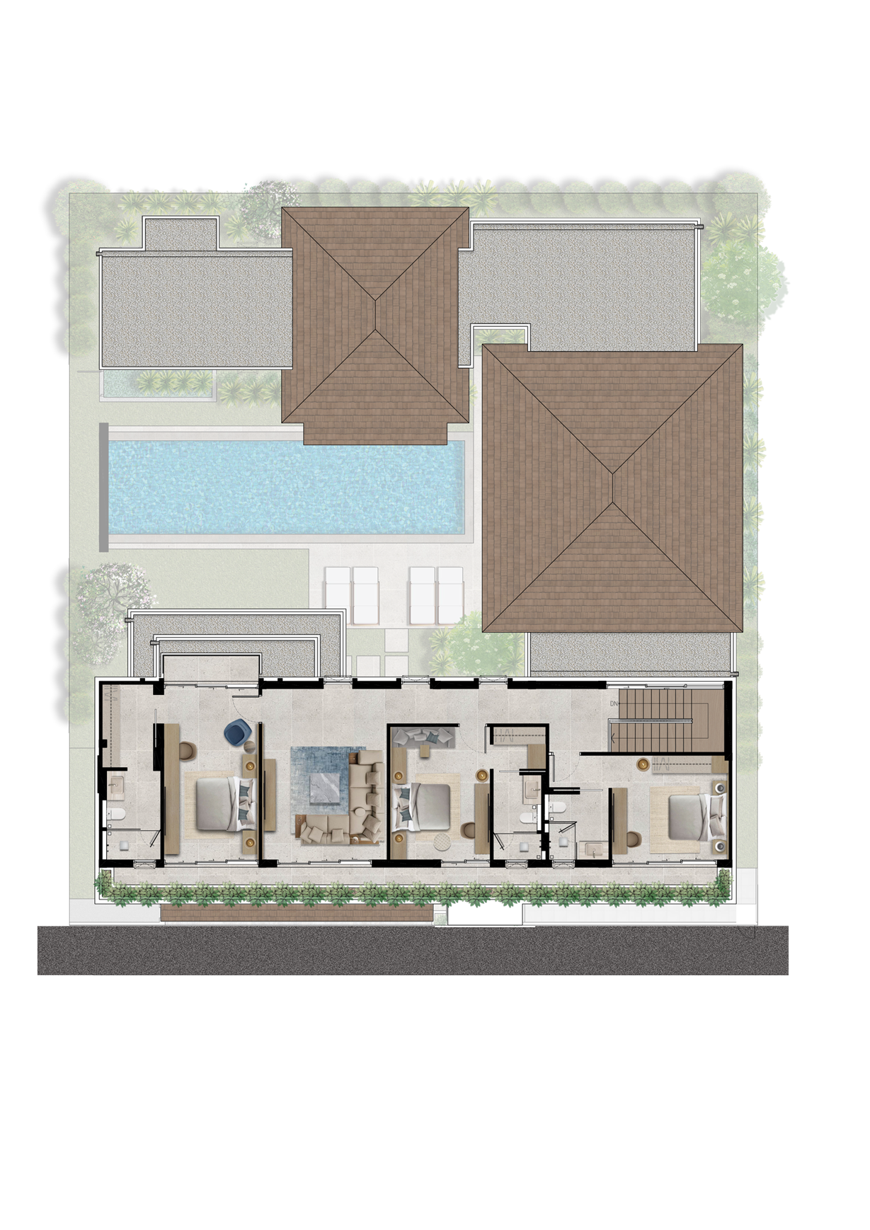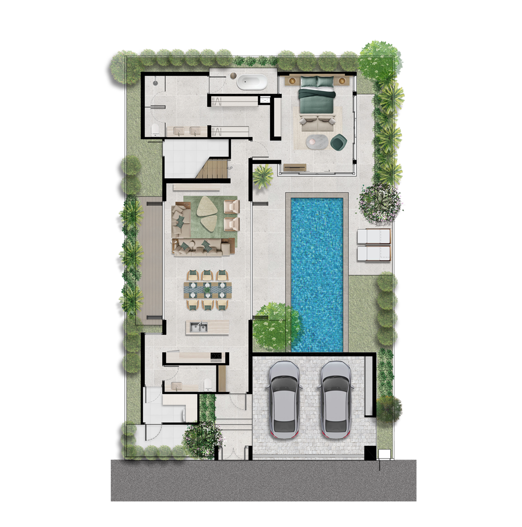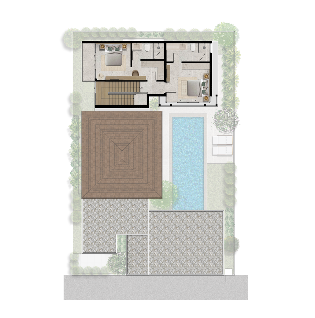 For families, those who desire more space, or both, the Type B villa adds ~60sq.m with a slightly different floor plan than the Type A. The main entrance leads from the car park through the saltwater pool and tropical garden. Here you can relax on the sundeck and enjoy outdoor meals in the dining sala with gas barbecue.
